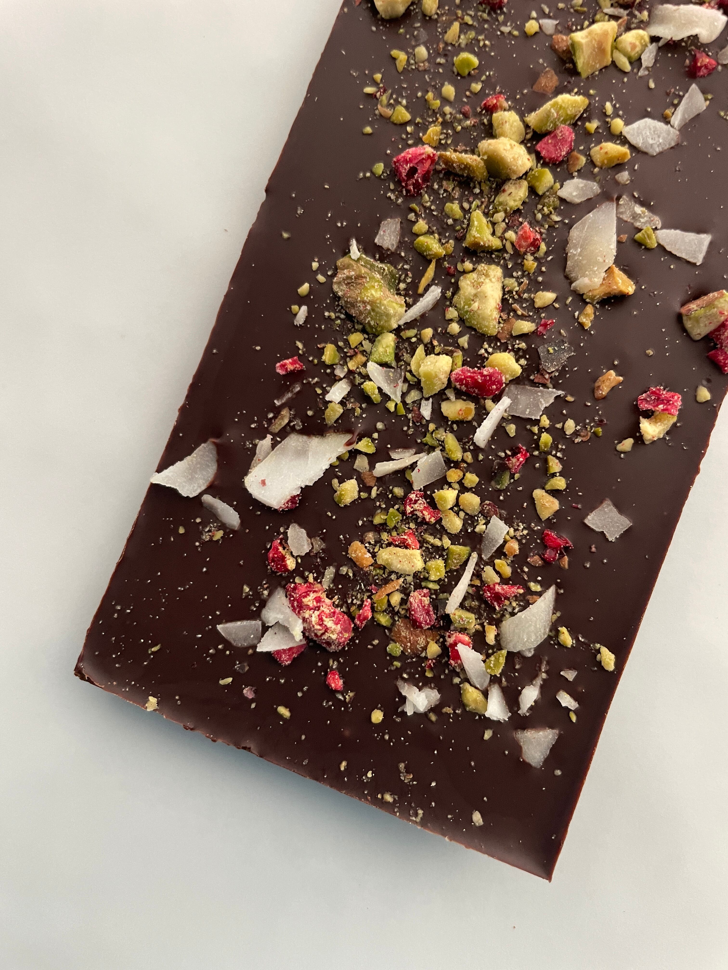 原材料 // カカオ豆(ガーナ産)、きび糖(国産)、ピスタチオ、ココナッツ、フランボワーズ