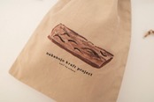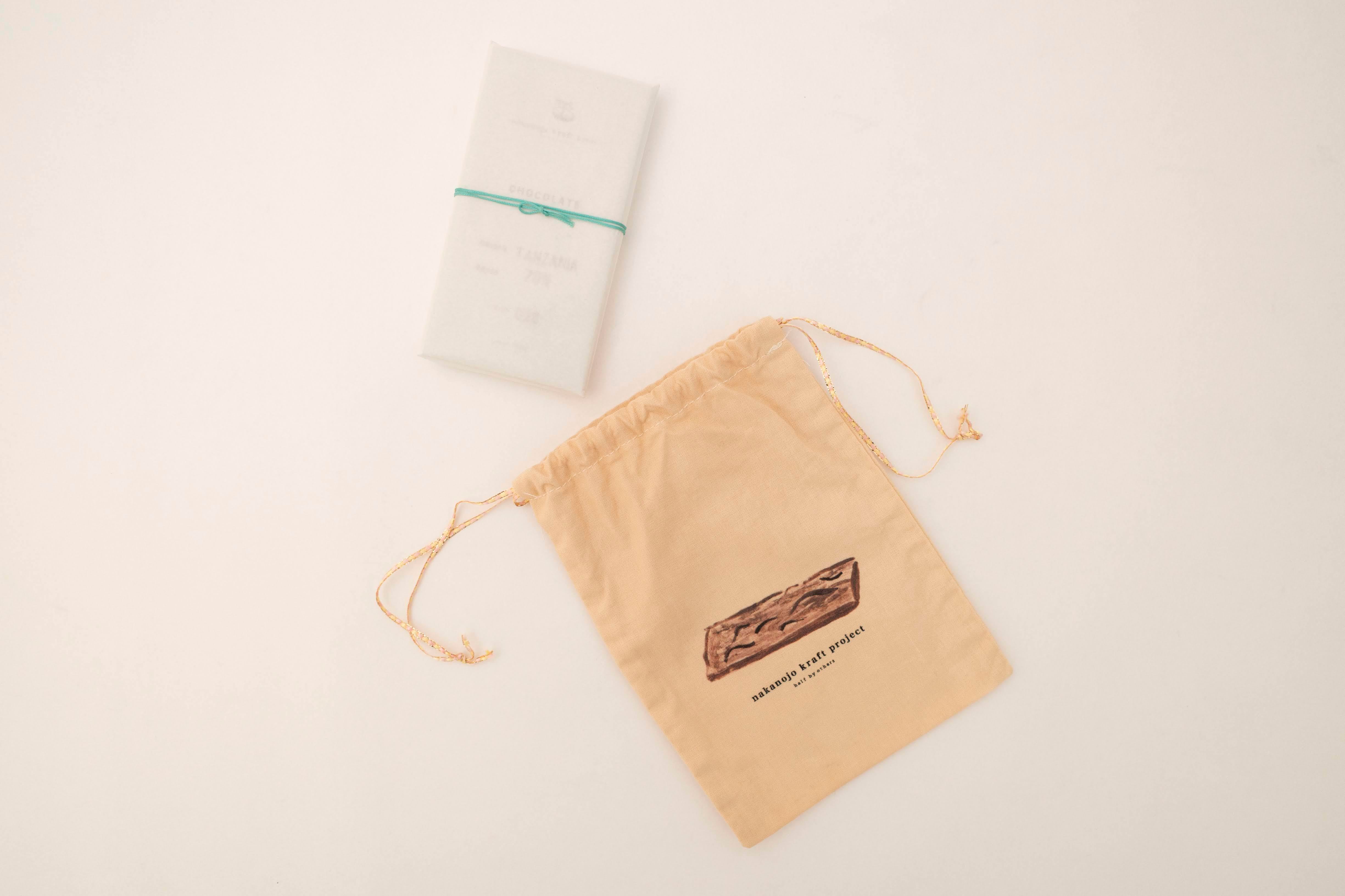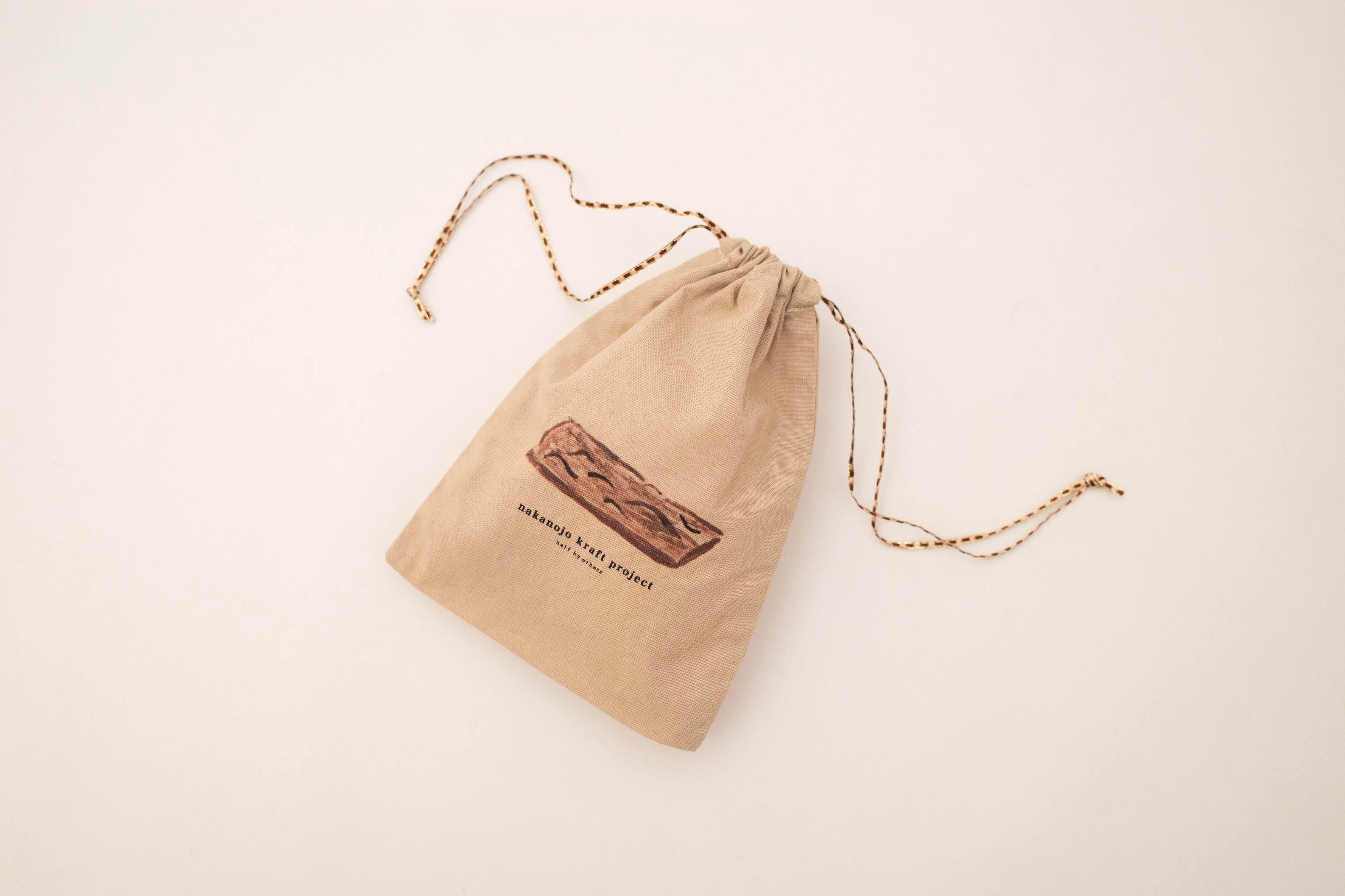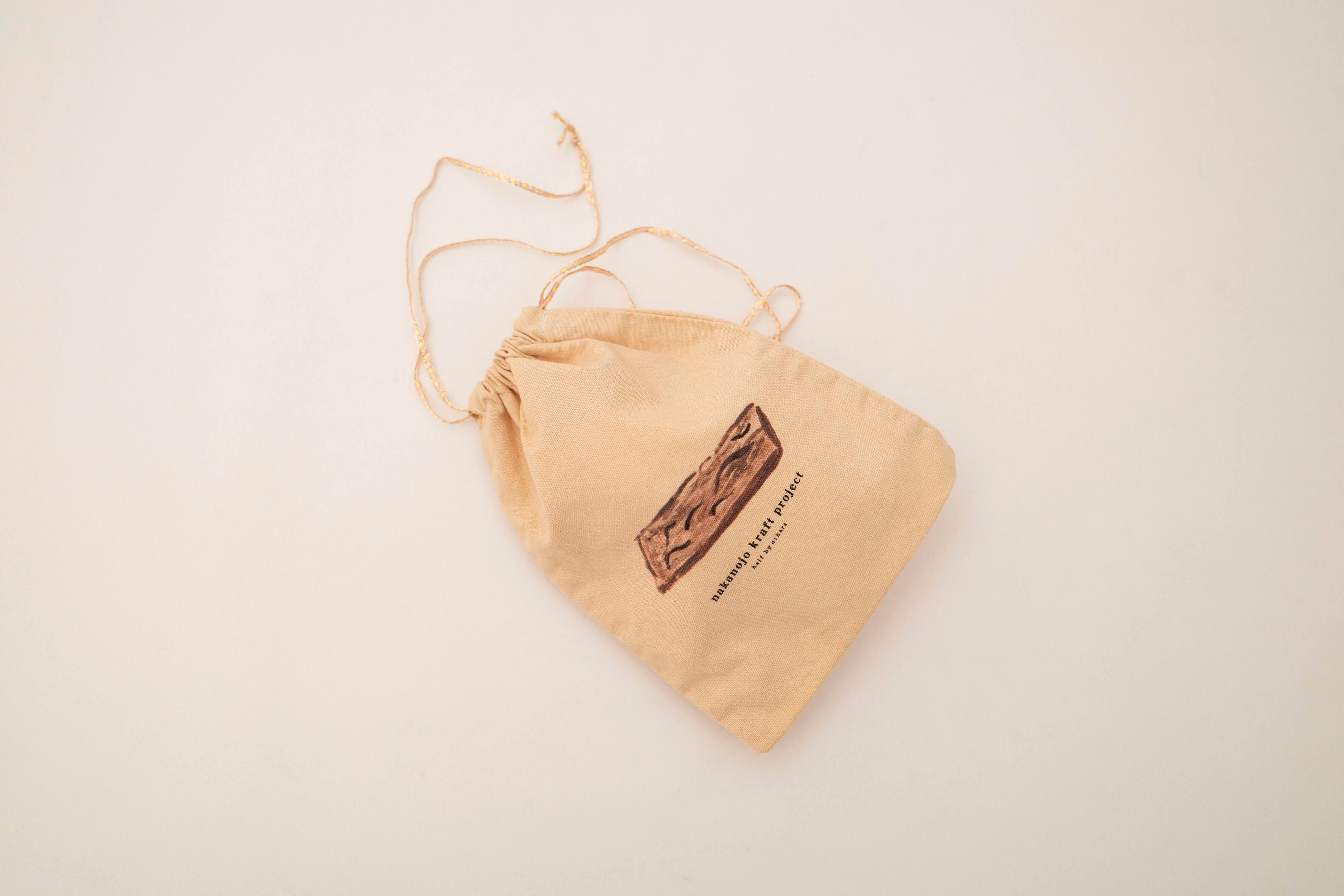 オリジナルプリントが施されたカカオ染のチョコ巾着。