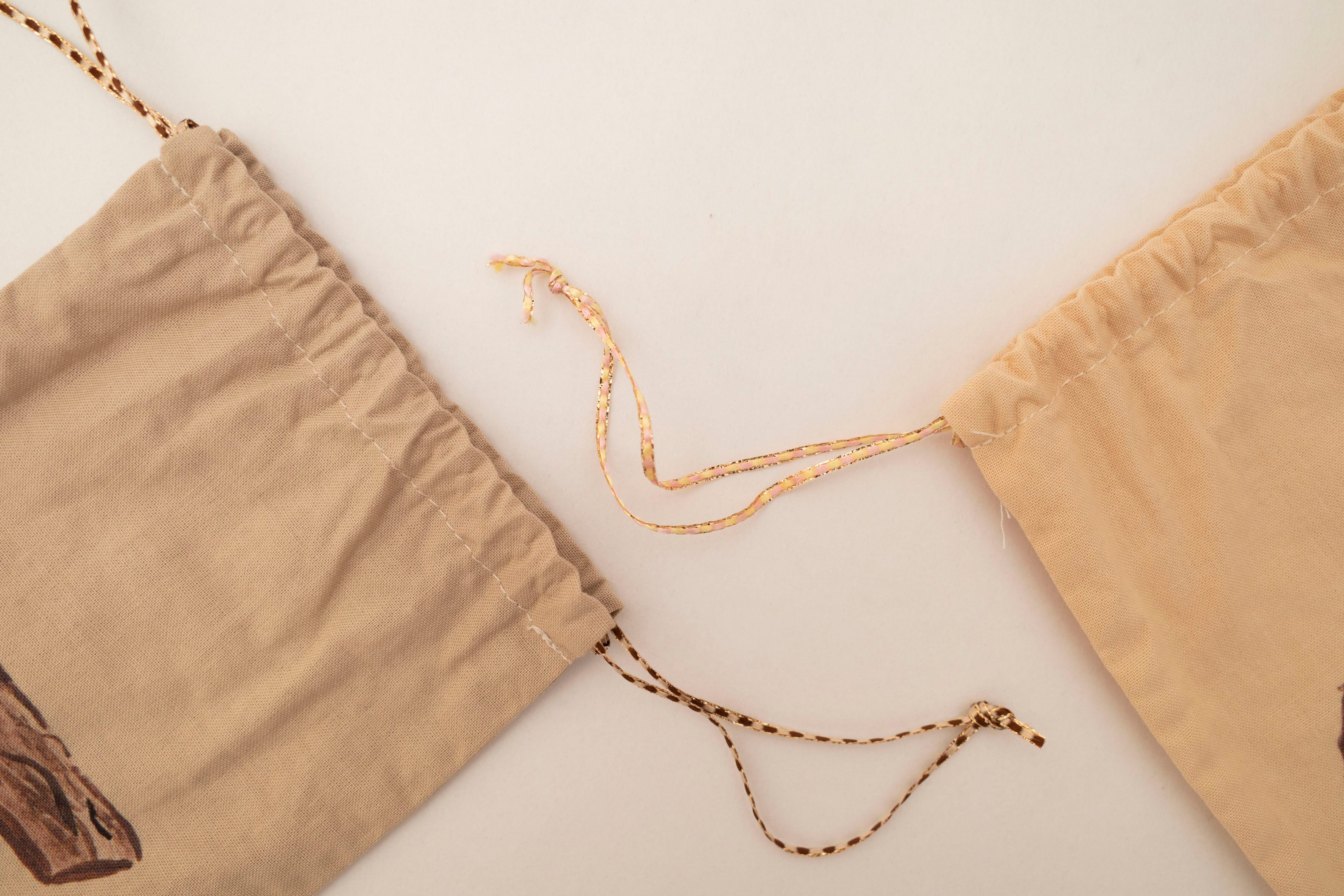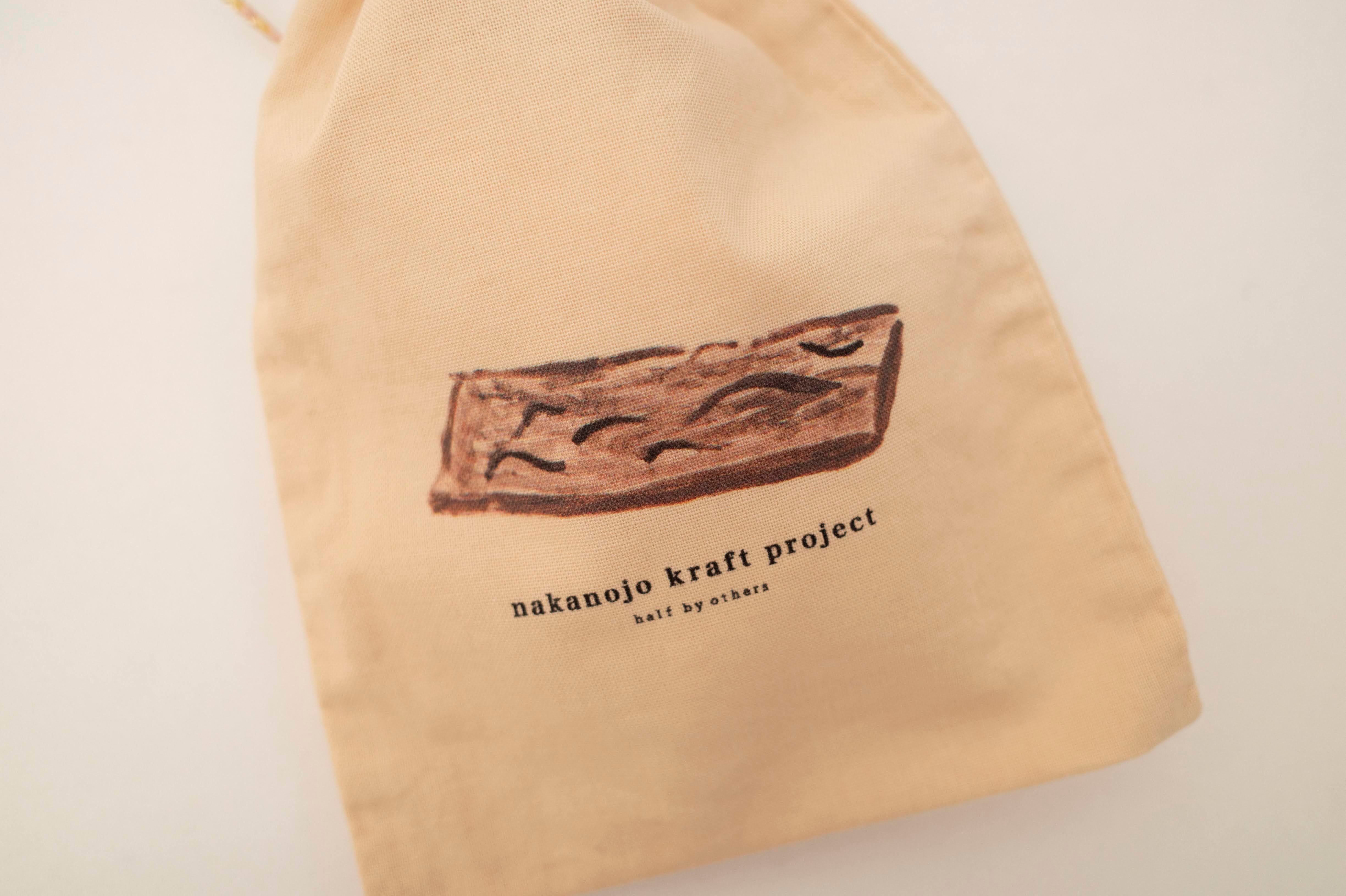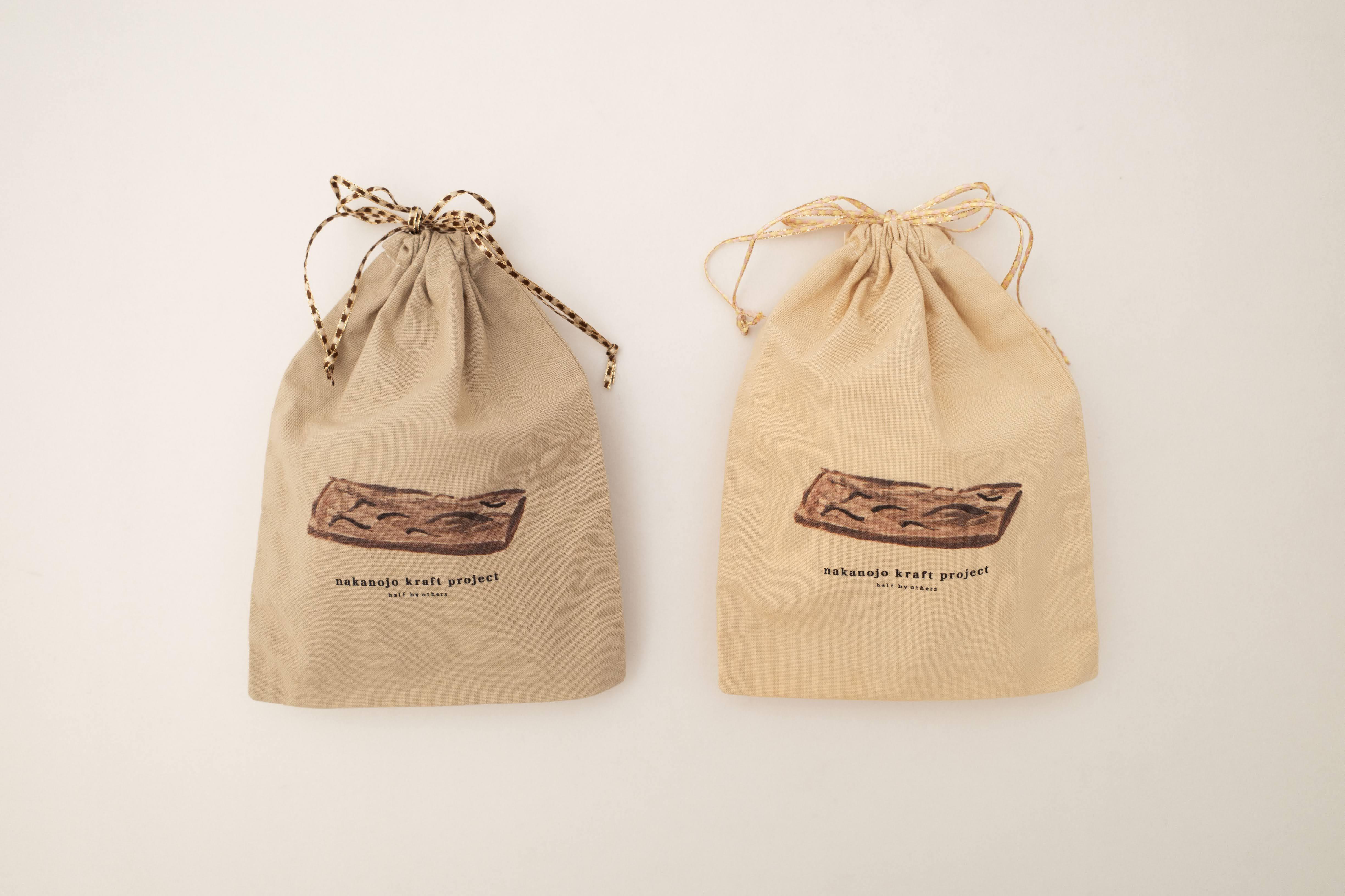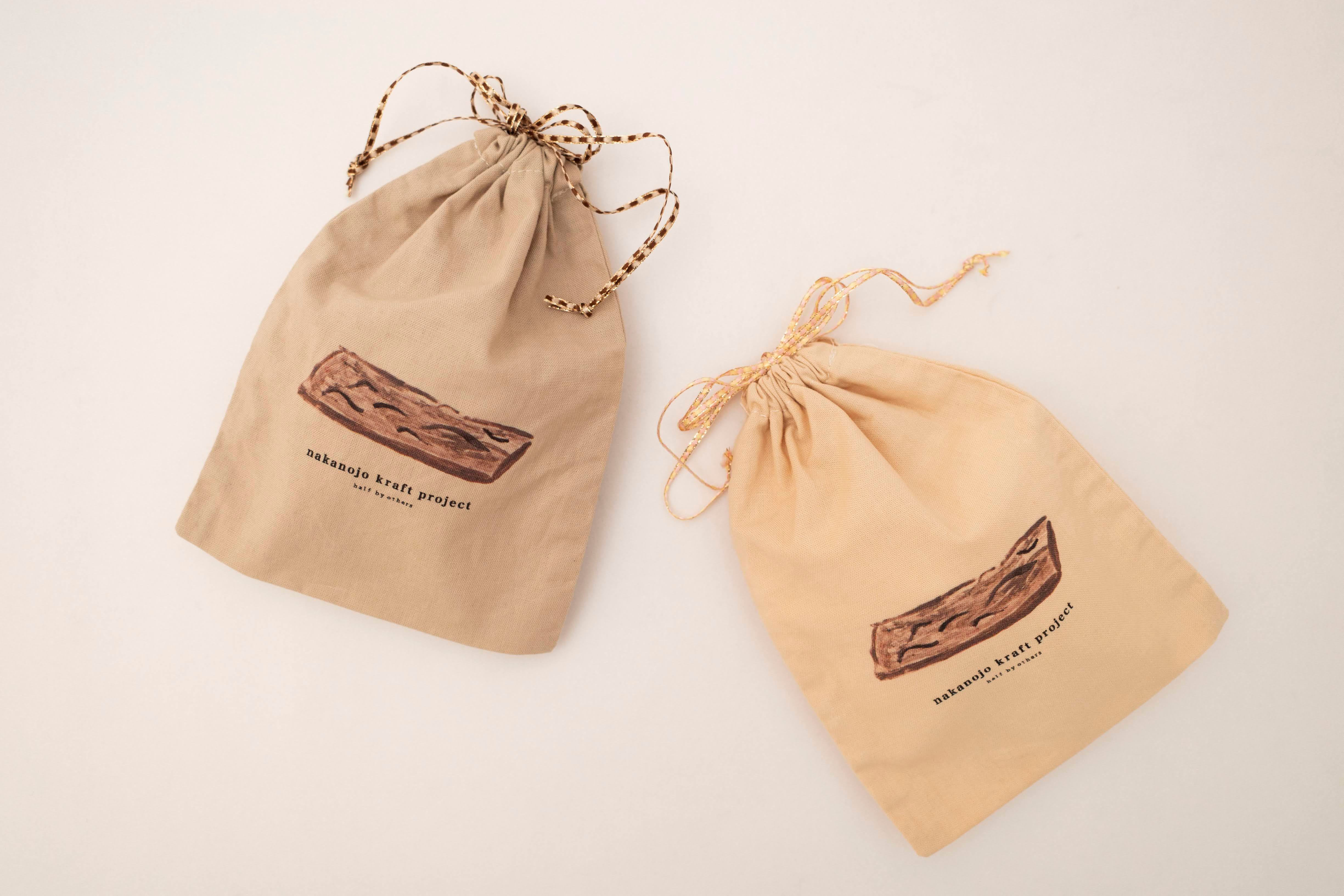 オリジナルプリントが施されたカカオ染のチョコ巾着。