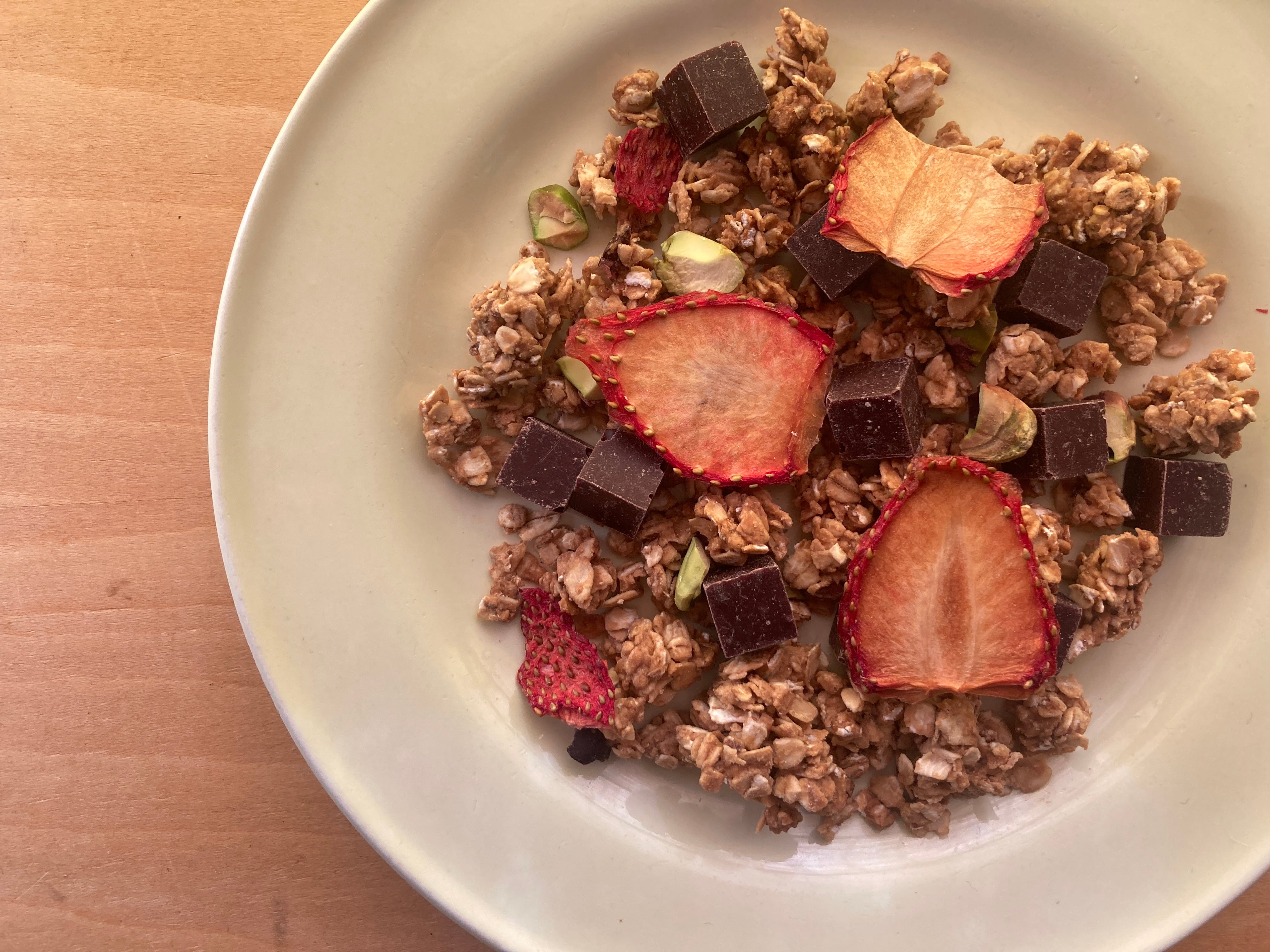 原材料 // オーツ麦(ラトビア産)、米粉、黒糖、豆乳、有機ココナッツオイル、カカオ豆、きび糖、ピスタチオ、苺