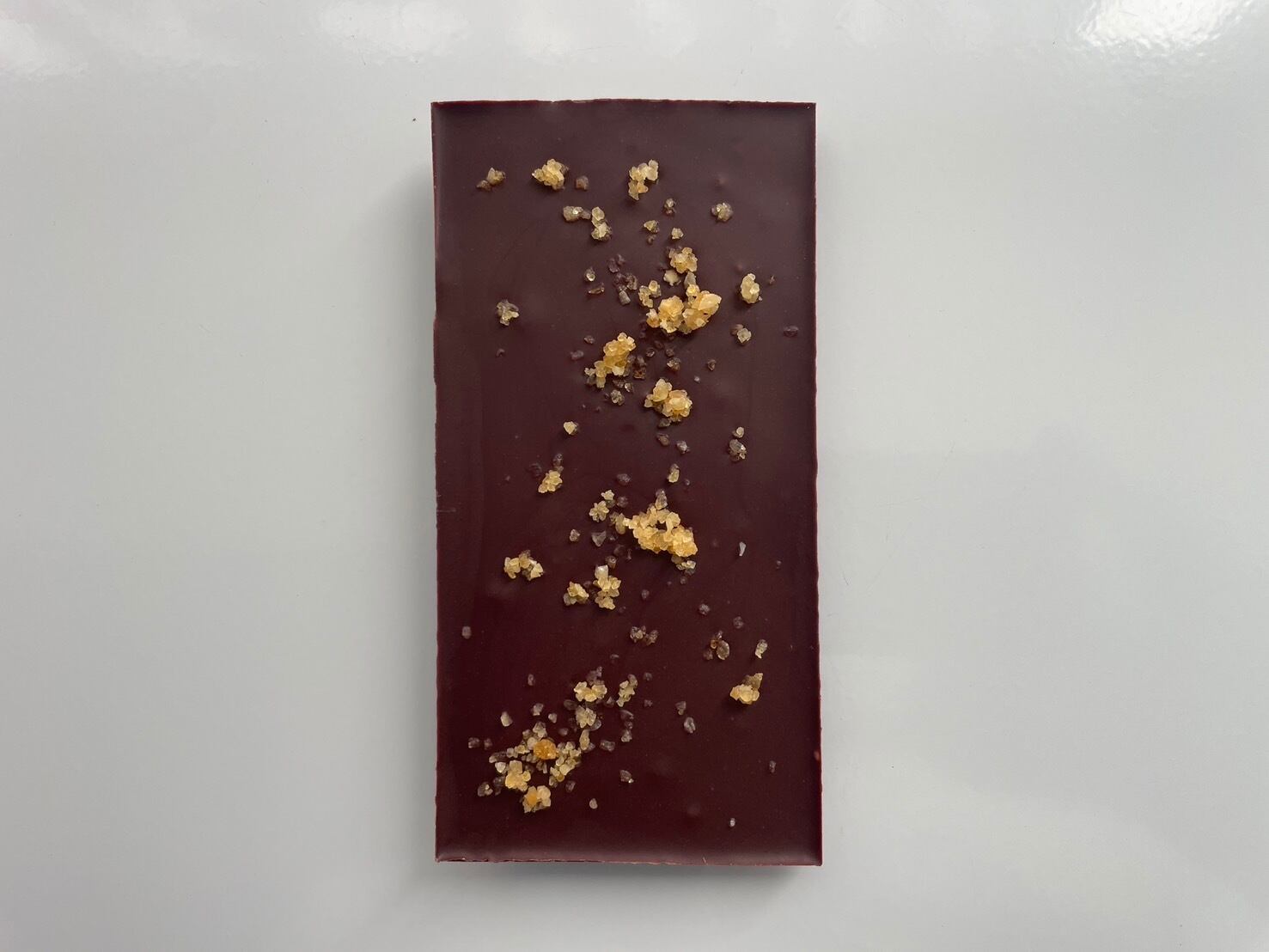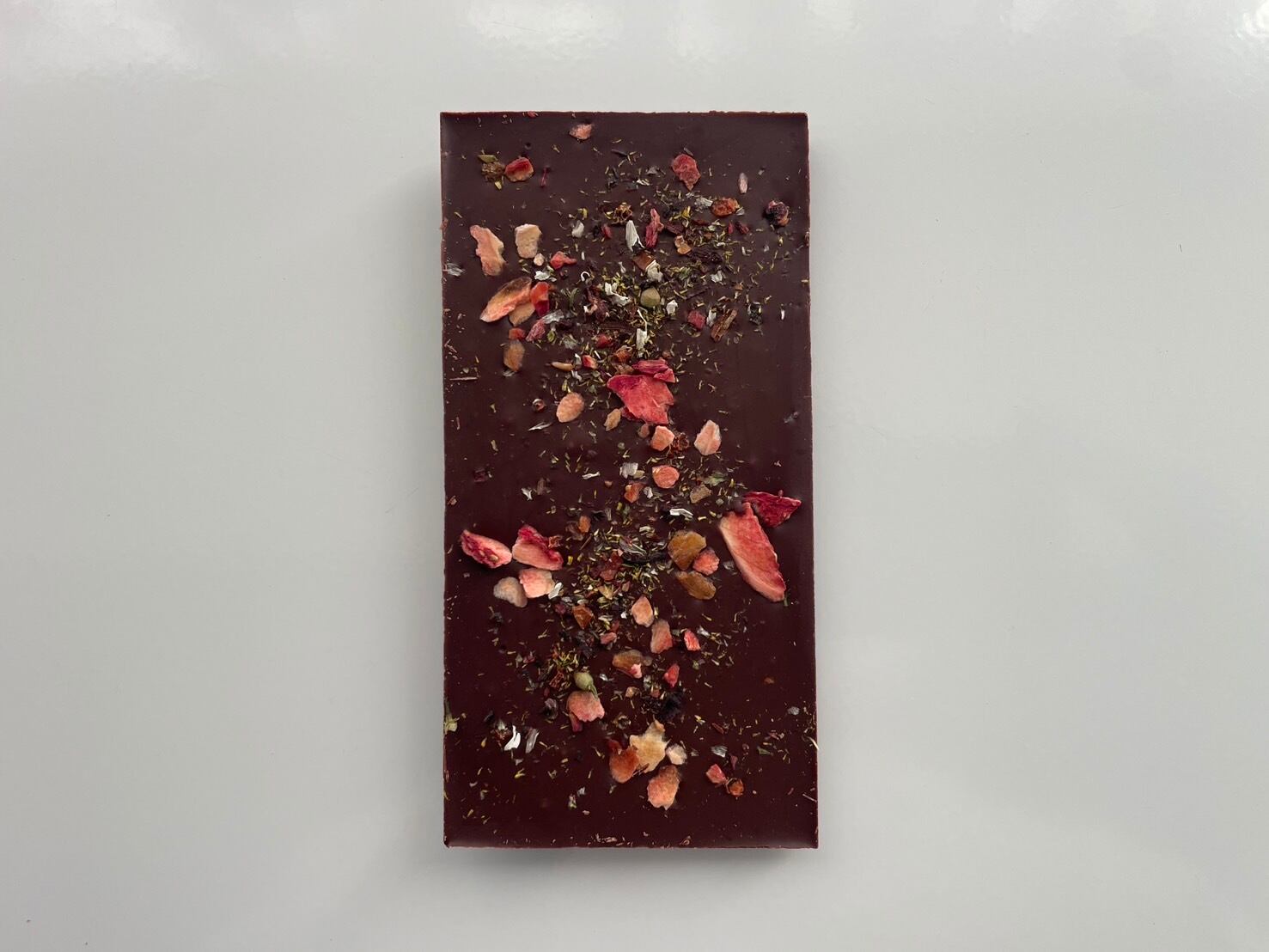 干し葡萄のようなフルーティーな酸味が特徴のインド産カカオ豆に、苺やハーブの甘酸っぱい香りと味わいが混ざり合ったチョコレート。華やかな広がりと濃厚な酸味が楽しめます。